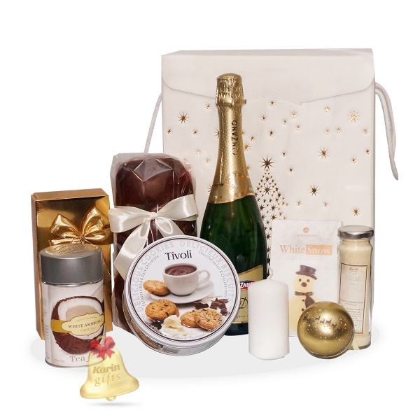 Elegant Christmas este un cadou deosebit ce contine specialitati dulci, precum cozonac, fursecuri daneze, zahar aromat, praline fine, drajeuri si ciocolata, toate acompaniate cu succes de o sampanie savuroasa si un sortiment special de ceai alb. Cadoul este decorat si ambalat manual, in spiritul Craciunului, gata de a fi oferit cu ocazia sarbatorilor de iarna.