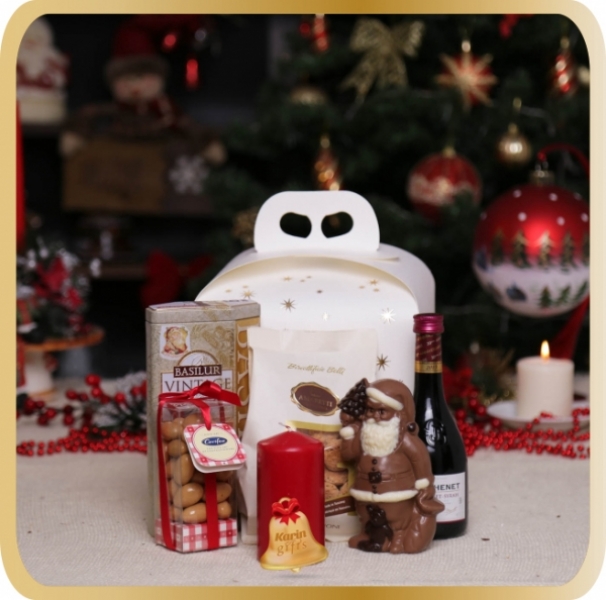 Mandorla este un cadou deosebit, ce contine specialitati dulci precum migdale in ciocolata, fursecuri, ceai, figurina de ciocolata, toate acompaniate de vin. Cosul cadou este ambalat si decorat manual, in spiritul Craciunului, gata de a fi oferit cu ocazia sarbatorilor de iarna.
