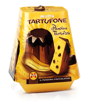 Panettone Tartufone cu un strat de ciocolata neagra delicioase care acoperă un aluat moale de aur umplute cu o cremă de alune delicioasa.