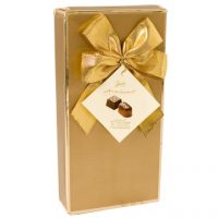 Cutie foarte eleganta cu praline belgiene, decorata cu fundita aurie. Are atasata eticheta cu descrierea sortimentului de praline continut in amestec de ciocolata neagra, alba si cu lapte.
