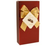 Cutie foarte eleganta cu praline belgiene, decorata cu fundita aurie. Are atasata eticheta cu descrierea sortimentului de praline continut.