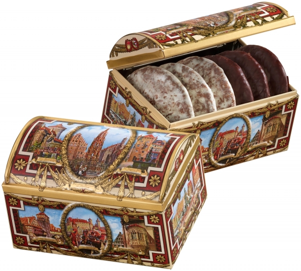 Imbietoarea aroma a Craciunului se regaseste in turta dulce de Nurnberg. Un cadou traditional intr-un minunat cufar metalic.